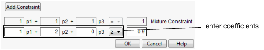Choose Add Constraint from the resulting window, and enter the coefficients into the appropriate boxes. For example, to enter the constraint p1 + 2*p2 ≥ 0.9, enter the coefficients as shown in Figure 2.8. As shown, if you are profiling factors from a mixture design, the mixture constraint is present by default and cannot be modified.