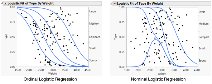 The Logistic platform fits the probabilities for response categories to a continuous x predictor. The fitted model estimates probabilities for each x value. The Logistic platform is the nominal or ordinal by continuous personality of the Fit Y by X platform. There is a distinction between nominal and ordinal responses on this platform: