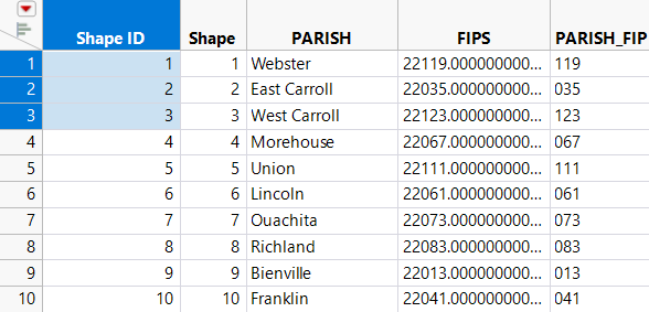 JMP opens the file as Parishes. The .dbf file contains identifying information.