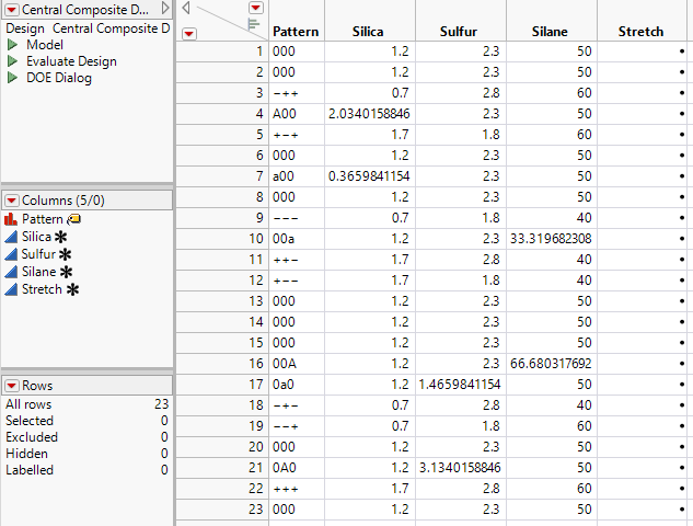 The Design note in the Table panel at the upper left gives the design type that generated the table (Central Composite Design). This information can be helpful if you are comparing multiple designs.