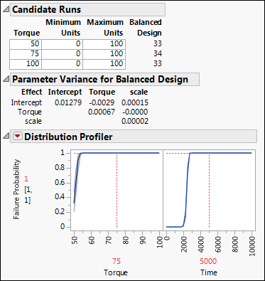 The number of runs in a balanced design appears in the Candidate Runs outline. The Parameter Variance for Balanced Design outline shows the covariance matrix for the parameters for this design. The Distribution Profiler also appears. When you obtain the optimal design, you can compare the Parameter Variance and Distribution Profiler results to those for the balanced design to see the reduction in uncertainty.