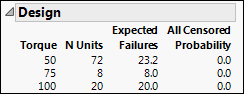 The optimal design is computed based on the levels of the test runs, the total number of units to be tested, and the prior information that you specified. The optimal design consists of testing the following number of units at each torque level: