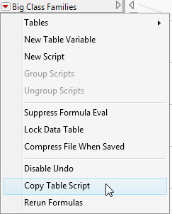 1. In the data table, click the red triangle next to the data table name and select Copy Table Script.