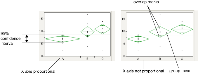 Figure 6.8 Examples of Mean Diamonds and X-Axis Proportional Options