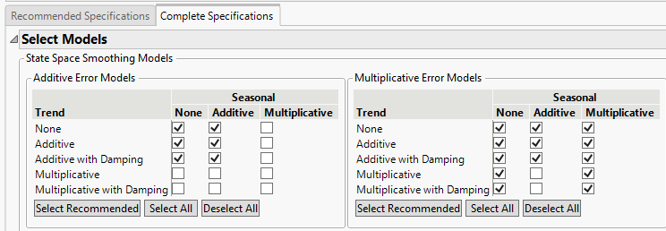 Available only in the Complete Specifications tab, shown in Complete Specifications Tab. The Select Models report enables you to specify the state space smoothing models to fit to the individual time series. Use the check boxes to select the error, trend, and seasonality for the models. Click Select Recommended to select the check boxes that correspond to the models recommended by the platform. Click Select All to select all check boxes or Deselect All to deselect all check boxes.