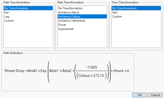 The Constant Rate option is for modeling degradation paths that are linear with respect to time (or linear with respect to time after transforming the response or time). The reaction rate is a function of temperature only.