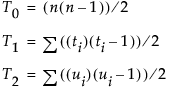 The ti (the ui) are the number of tied x (respectively y) values in the ith group of tied x (respectively y) values.