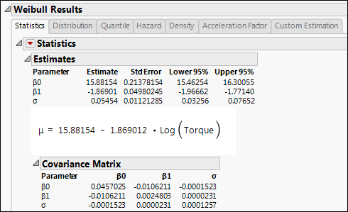 9. Scroll down to the Weibull Results outline and open the Covariance Matrix outline.