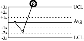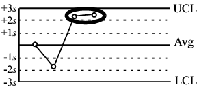 Two out of three points in a row in or beyond Zone A and the point itself is in or beyond Zone A; the two points must be on the same side (upper or lower)