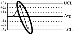 Rule R 4S (called Test 12 in JMP) is triggered when one measurement is greater than two standard deviations from the mean and the previous measurement is greater than two standard deviations from the mean in the opposite direction such that the difference is greater than 4 standard deviations.