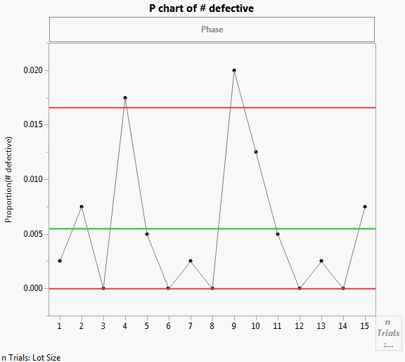 To view the differences between constant and variable sample sizes, you can compare charts for Lot Size and Lot Size 2 by simply dragging the variables to the nTrials zone.