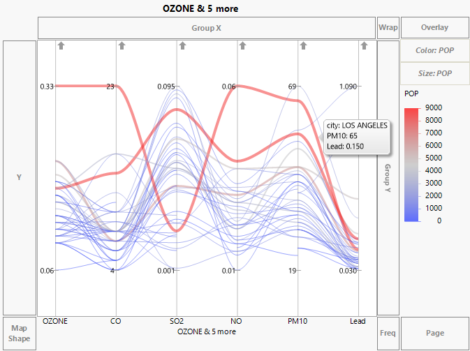 Figure 3.43 shows a parallel plot for six variables in the Cities.jmp data table. The variable POP is used both as a Color and Size variable. The curve for Los Angeles is labeled.