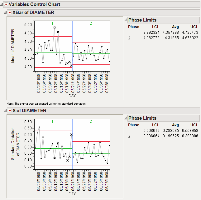Open Diameter.jmp, found in the Quality Control sample data folder. This data set contains the diameters taken for each day, both with the first prototype (phase 1) and the second prototype (phase 2).