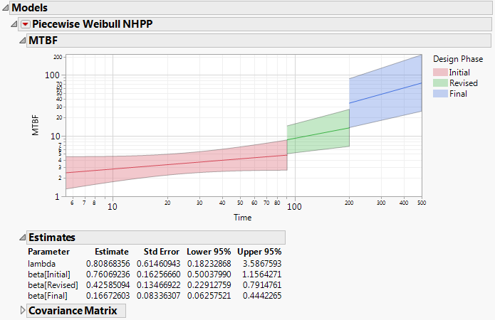 The Piecewise Weibull NHPP report is found under the Models outline node. Here we see the mean time between failures increasing over the three phases. From the Estimates report, we see that the estimates of beta decrease over the three testing phases.