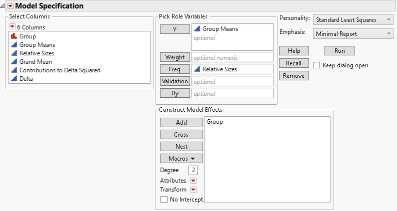 Next, use Fit Model to fit a one-way analysis of variance model (Figure 3.73). Note that Relative Sizes is declared as Freq in the launch window. Also, the Minimal Report emphasis option is selected.