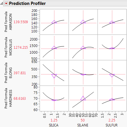 Note: In many situations, the settings that optimize the desirability function are not unique. The Maximize Desirability option gives one such setting. The Contour Profiler is a good tool for finding alternative factor combinations that optimize desirability. For an example, see Explore Optimal Settings in the Contour Profiler section.