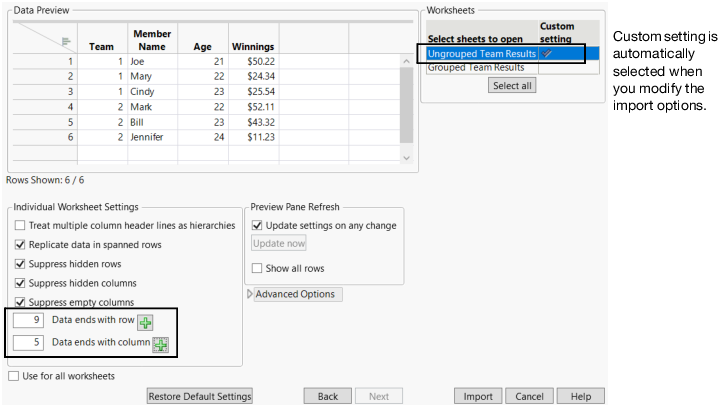 JMP remembers your previous changes each time you import a worksheet, even after closing and reopening JMP. This feature is very helpful when you want to reimport the same worksheet several times and experiment with options. To clear those changes when you import a different worksheet, click Restore Default Settings.