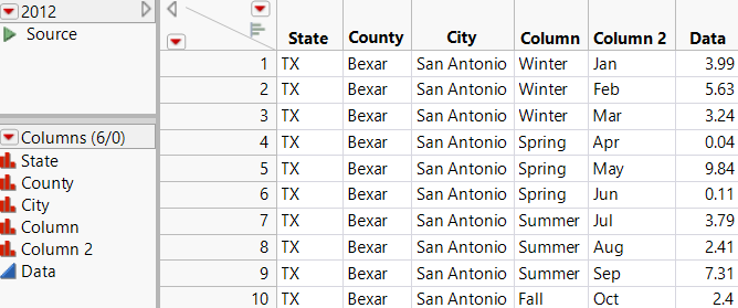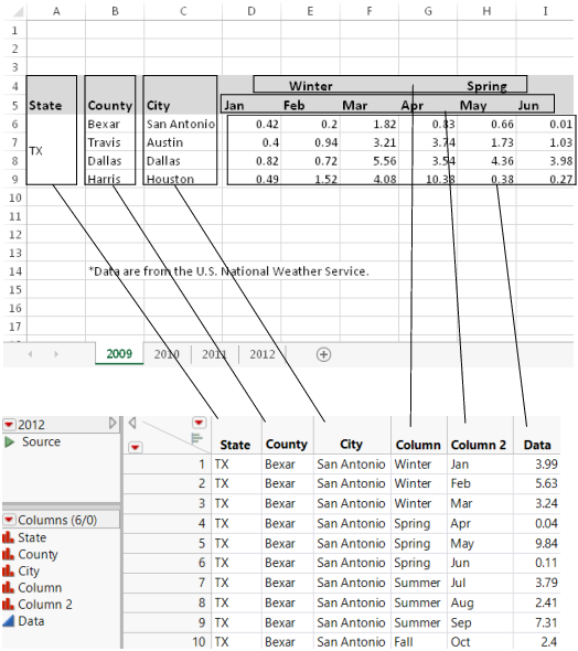 In an Excel worksheet, multiple header rows can have an implied hierarchy; the second header row contains data that are categories of the first header row. Figure 3.8 shows an example. In the worksheet at the top, the seasons “Winter” and “Spring” are in spanned cells above the months within those seasons. In the JMP data table, you want the seasons in one column and their corresponding months in another column.