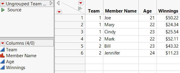 For the figures in this example, we used the Team Results.xlsx file located in the JMP Samples/Import Data folder. The file has the following characteristics: