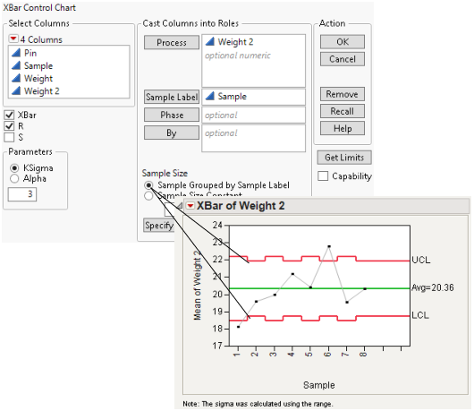 The Sample Label role enables you to specify a variable whose values label the horizontal axis and can also identify unequal subgroup sizes. If you do not specify a sample label variable, the samples are identified by their subgroup sample number.