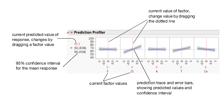 The black lines within the plots show how the predicted value changes when you change the current value of an individual X variable. The 95% confidence interval for the predicted values is shown by a dotted curve surrounding the prediction trace (for continuous variables) or an error bar (for categorical variables).