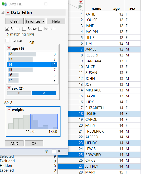 age and sex are in the same group. In the data table, rows that meet either the age OR sex conditions are selected. That is, all 14-year-olds and all males are selected in the data table.