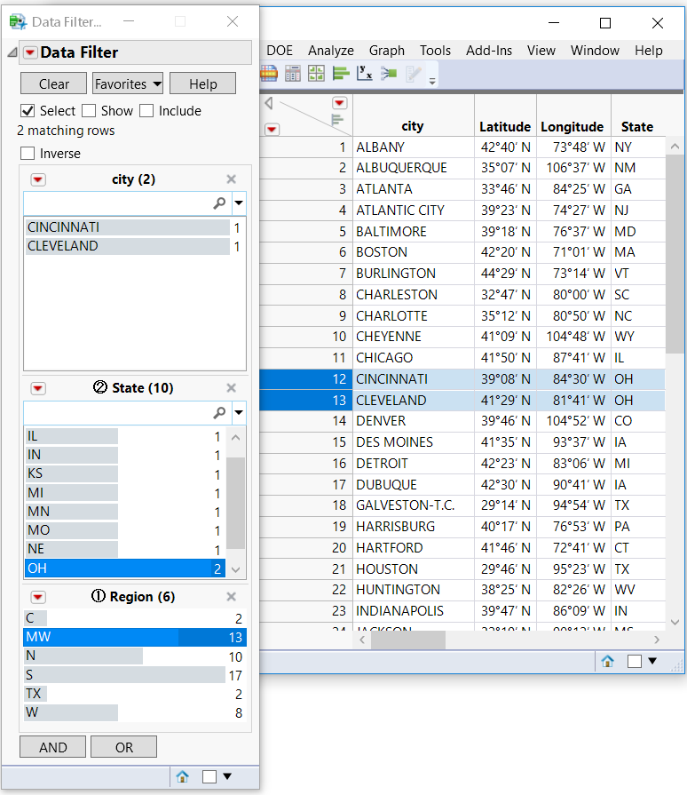 The cities that are in Ohio and in the Midwest region are selected in the data table. In the Data Filter window, only Midwestern states appear in the State list, and only cities in Ohio appear in the cities list.