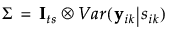 Denote the block diagonal component of the covariance matrix Σ corresponding to the ikth subject within treatment by Σik. In other words, Σik = Var(yik|sik). Because observations over time within a subject are not typically independent, it is necessary to estimate the variance of yijk|sik. Failure to account for the correlation leads to distorted inference.