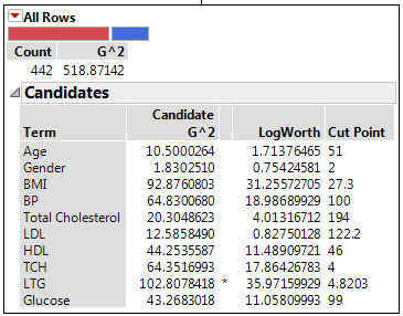 The optimal split is noted by an asterisk. However, there are cases where the Candidate G2 is higher for one variable, but the Logworth is higher for a different variable. In this case > and < are used to point in the best direction for each variable. The asterisk corresponds to the condition where they agree. See Statistical Details for the Partition Platform.