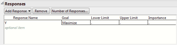 The Goal, Lower Limit, Upper Limit, and Importance that you specify when you enter a response are used in finding optimal factor settings. For each response, the information is saved in the generated design data table as a Response Limits column property. JMP uses this information to define the desirability function. The desirability function is used in the Prediction Profiler to find optimal factor settings. For further details about the Response Limits column property and examples of its use, see Response Limits in the Column Properties section.