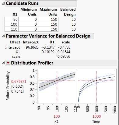 Enables you to explore failure probabilities, based on the balanced design, as you vary the acceleration factors and time. The probabilities are based on the assumption that the values specified in the Prior Mean are the true parameter values.