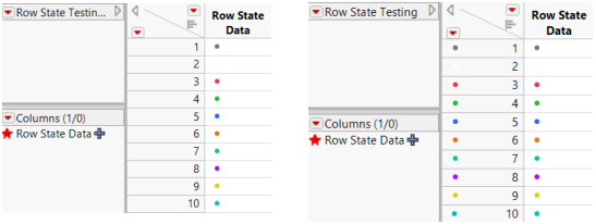 dt << Clear Selected Row States();This section discusses conditions that have many choices. These conditions include: coloring, adding markers, different hues, or different shades to rows.