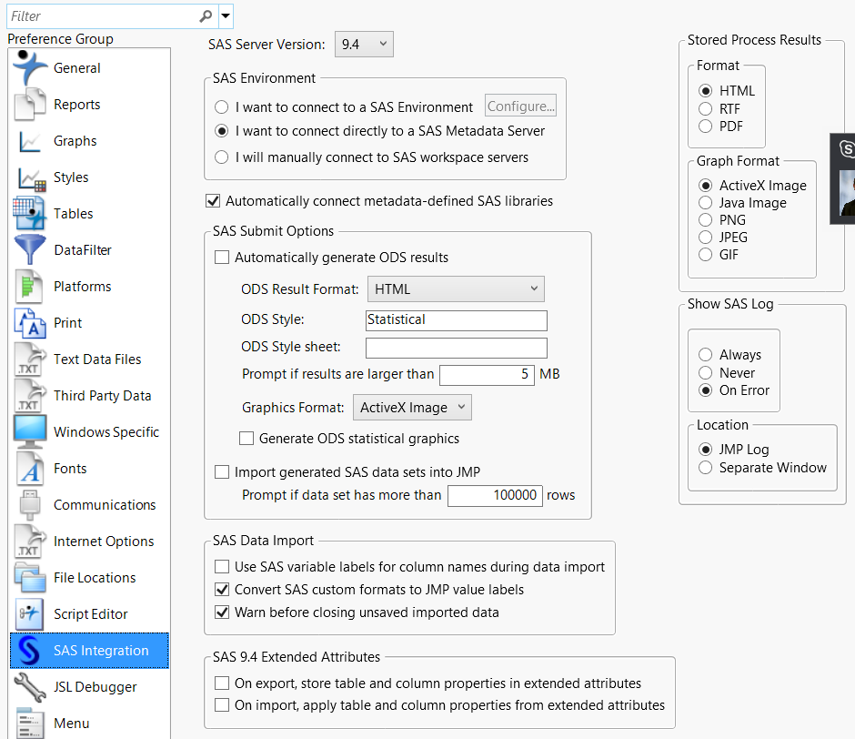 SAS Integration preferences customize the default settings for working with SAS servers. For more information about using the SAS Integration capabilities, see Import Data from SAS in the Import Your Data section.