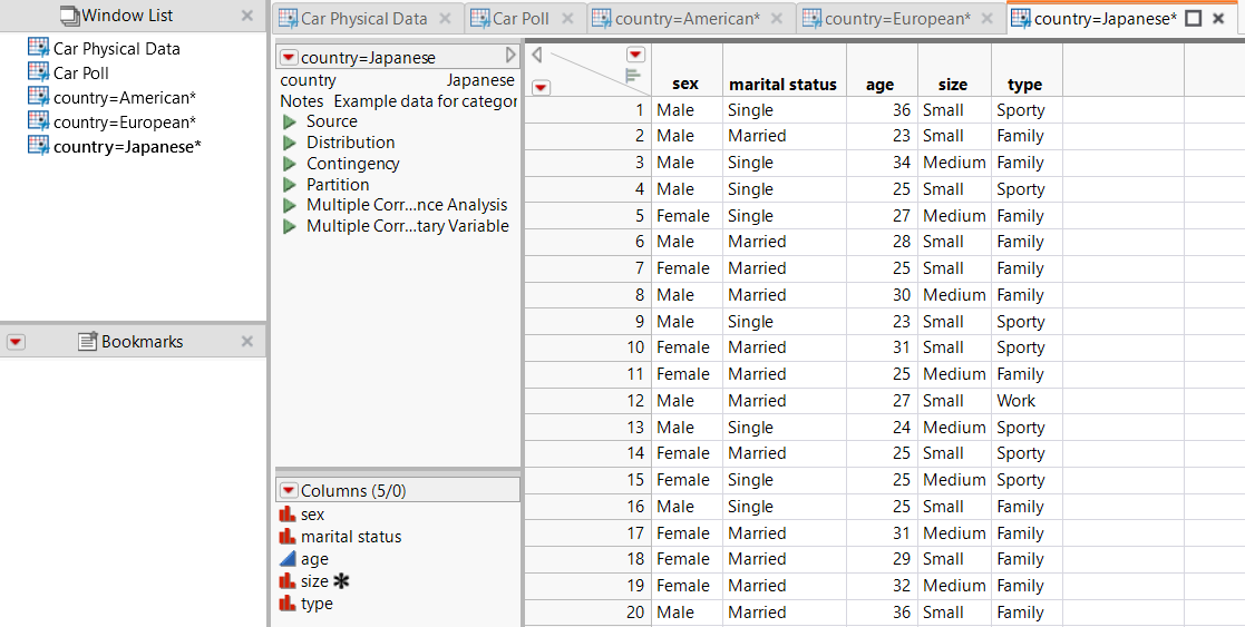 Three new data tables subset by country are created in the project. Notice the asterisk on the tab of each new data table.