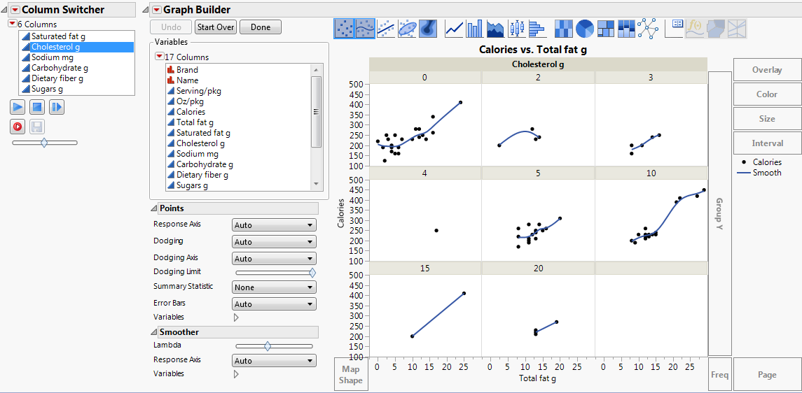You can see that the relationship between calories and fat is relatively strong for each level of carbohydrate. Therefore, Carbohydrate g appears to be the best predictor of calorie levels.