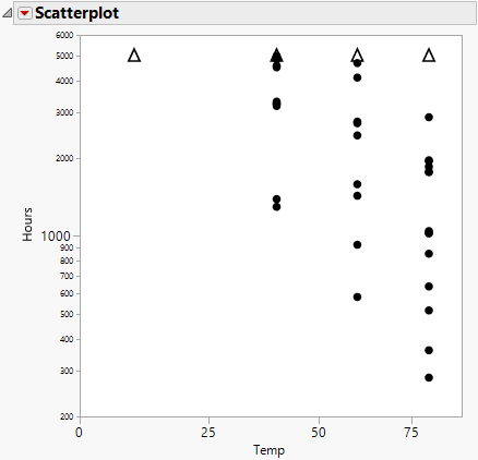 The Scatterplot of the lifetime event versus the explanatory variable is shown at the top of the report window. For the Devalt.jmp sample data, the Scatterplot shows Hours versus Temp. Table 4.2 indicates how each type of failure is represented on the Scatterplot in the report window. To increase the size of the markers on the graph, right-click the graph, select Marker Size, and then select one of the marker sizes listed.