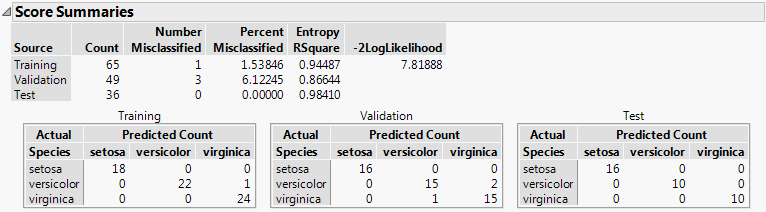 Shows matrices of actual by predicted counts for each level of the categorical X. If you are using JMP Pro with validation, a matrix is given for each set of observations. If you are using JMP with excluded rows, the excluded rows are considered the validation set and a separate Validation matrix is given. See Validation in JMP and JMP Pro.
