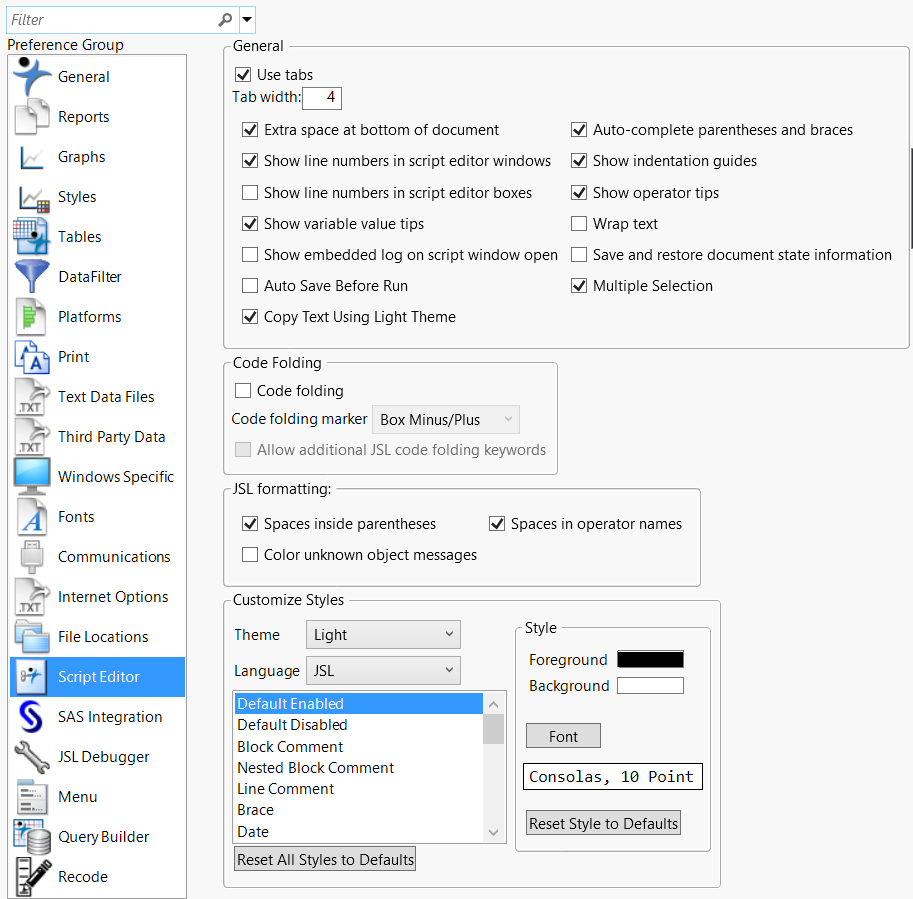 Script Editor preferences customize the appearance of the JSL Script Editor, such as tab width, syntax coloring, and tooltips.