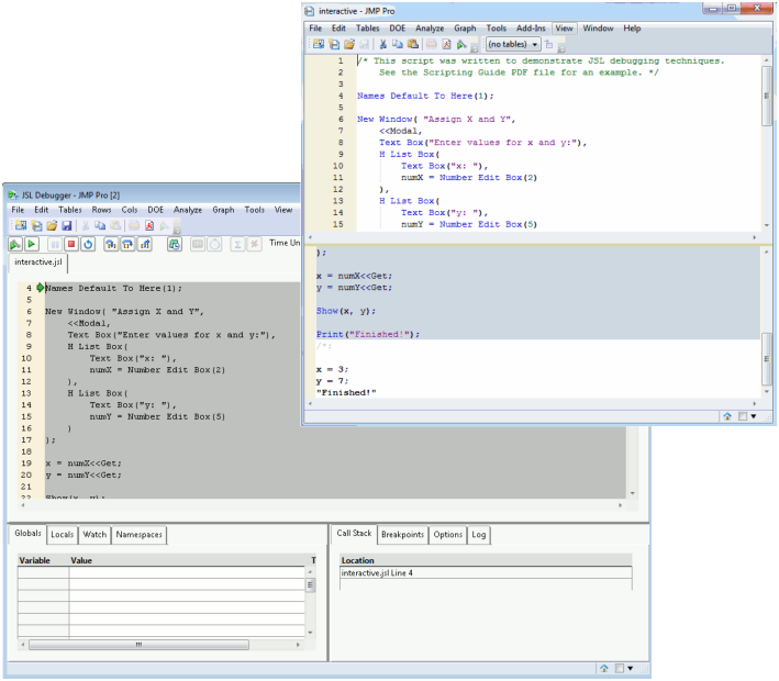 JMP provides several programming tools for script writers. The script editor supports syntax coloring, autocompletes functions as you type, highlights matching braces, allows for code folding, and has additional features to help you develop scripts more quickly. Error messages and output are shown in the log window, which can be displayed inside the script editor. The JMP Scripting Language (JSL) Debugger and Profiler can help you troubleshoot your scripts.