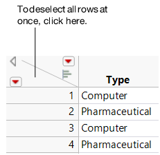 You can select rows, columns, or cells within a data table. For example, to create a subset of an existing data table, you must first select the parts of the table that you want to subset. Also, selecting rows can make data points stand out on a graph. Select rows and columns manually by clicking, or select rows that meet certain search criteria. This section contains the following information: