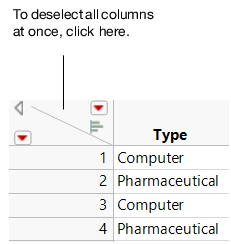 Deselect all columns | Click in the upper-triangular space in the top left corner of the table (Figure 3.9). |