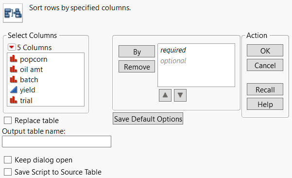 6. Enter a name for the new sorted table in the box beside Output table name. For this example, enter sorted popcorn.