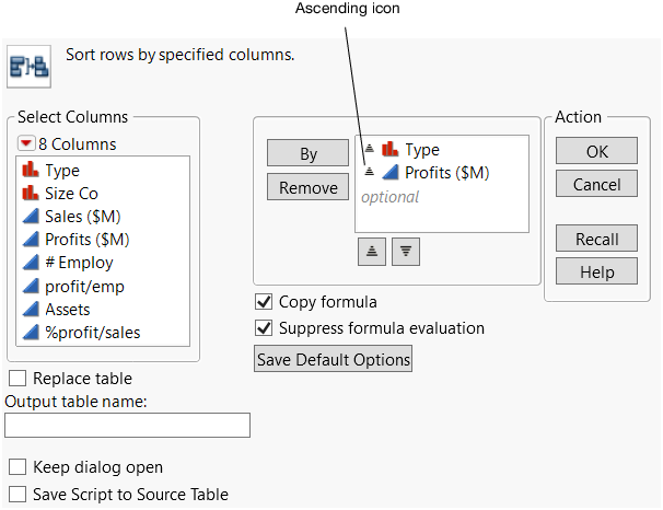 When selected, the Replace Table option tells JMP to sort the original data table instead of creating a new table with the sorted values. This option is not available if there are any open report windows created from the original data table. Sorting a data table with open report windows might change how some of the data is displayed in the report window, especially in graphs.