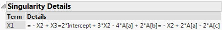 When there are linear dependencies among model effects, the Singularity Details report appears as the first report under the Response report title. It contains a table of the linear functions that the model terms satisfy. These functions define the aliasing relationships among model terms. Figure 3.7 shows an example for the Singularity.jmp sample data table.