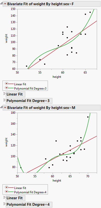 The following example uses the Big Class.jmp data table, which contains the names, ages, sex, heights, and weights for 40 students. Create a bivariate report of weight by height, using sex as a By variable, and adding a variety of fits.