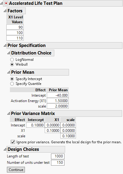 Select a life distribution (Weibull or LogNormal) for each acceleration factor. See Statistical Details for the ALT Design Platform.