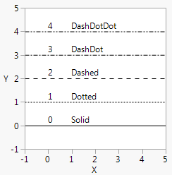 You can also control Line Style() by number (0–4) or name (Solid, Dotted, Dashed, DashDot, DashDotDot). Figure 12.21 shows the numerical values for each line type.