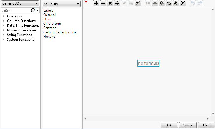 2. Click the SQL Vendor Name Browser to select the type of SQL that you want to use: GenericSQL, Access, DB2, MySQL, Oracle, SQL Server, or all of the above. Perform an action by clicking a function or operator in the list and selecting an operator from the list that appears.