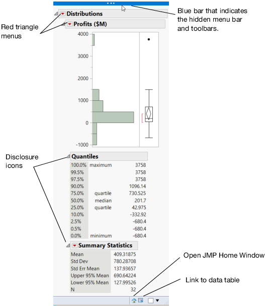 • On Windows, click the JMP Home Window button in the lower right corner to view the Home Window. On macOS, select Window > JMP Home.