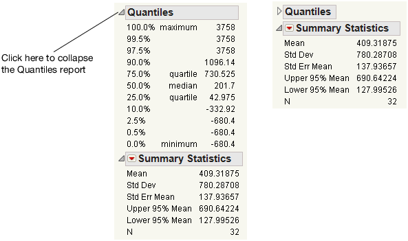 For example, to close the Quantiles report, click the disclosure icon next to Quantiles.